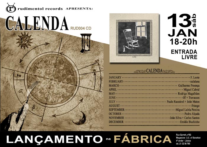 O espectro sonoro é alargado, e "da electrónica, passando pelos instrumentos convencionais, eléctricos e acústicos, até à samplagem ou às gravações de ambientes, tudo cabe neste calendário" (Rudimentol Records) - ou uma louca aventura experimental. Com o ano de 2006 nas lonas, "Calenda" parece ser o amigo perfeito para os meses do novo ano que se avizinham...o alinhamento não engana...nem o resultado final! Grande lançamento.